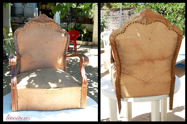 El primer dia del procés de restauració, després de treure-li un tapissat de quadres verds, blancs i vermells (que no hi pegava massa però que hem guardat per fer servir de patró), fa aquesta pinta.