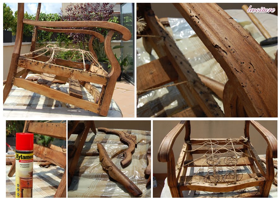 Després d'una primera capa més aviat superficial, passo a una segona, en profunditat, per les juntures de les diferents parts de la cadira. Si no surten 25 "tisoretes" no en surt cap. En fi, estic decidida a restaurar-la, així que amb l'inestimable ajuda del meu marit supero aquesta primera fase.