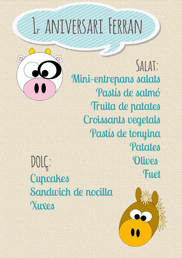 El contraste entre tipografías muy diferentes suele dar muy buen resultado. Como con estas dos fuentes para descargar gratis, la Amatic y la Lobster Two. Yo las hice servir para el cumple de Ferran en las invitaciones, el cartel de la entrada, los regalos y en la minuta que quedó así: